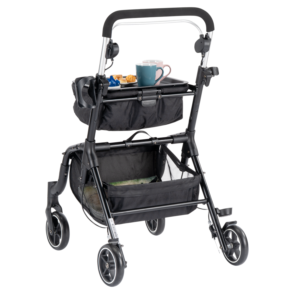 Compacte MultiMotion Home rollator voor binnenshuis. Met doorlopende duwstang en rem, veel opbergruimte en inclusief dienblad en bekerhouder.